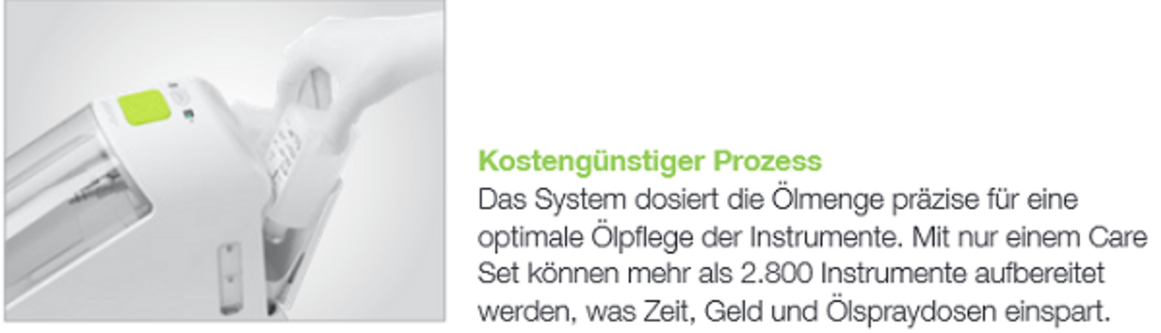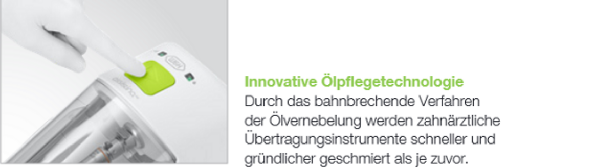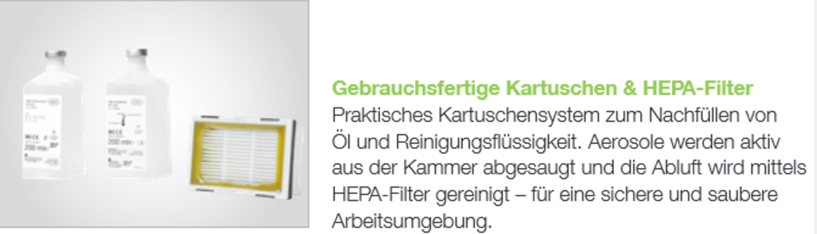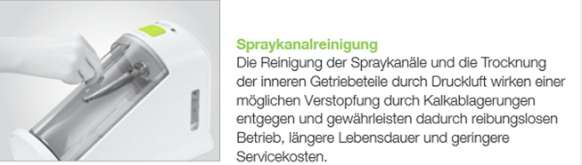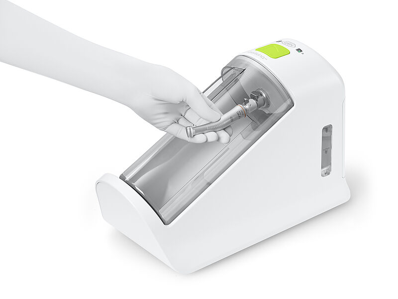 - Mit ihrer One-Touch-Starttaste und dem praktischen Kartuschensystem zum Nachfüllen von Öl und Reinigungsflüssigkeit ist sie eine moderne Wartungslösung für Zahnarztpraxen und Zahnkliniken mit hohen Ansprüchen an die Handstückpflege.